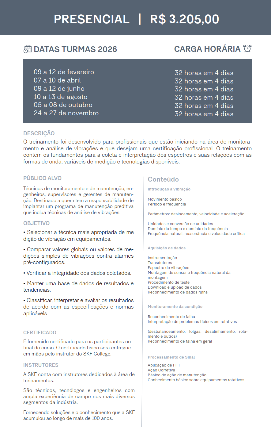O treinamento foi desenvolvido para profissionais que estão iniciando na área de monitoramento e análise de vibrações e que desejam uma certificação profissional.O treinamento contém os fundamentos para a coleta e interpretação dos espectros e suas relações com as formas de onda, variáveis de medição e tecnologias disponíveis.