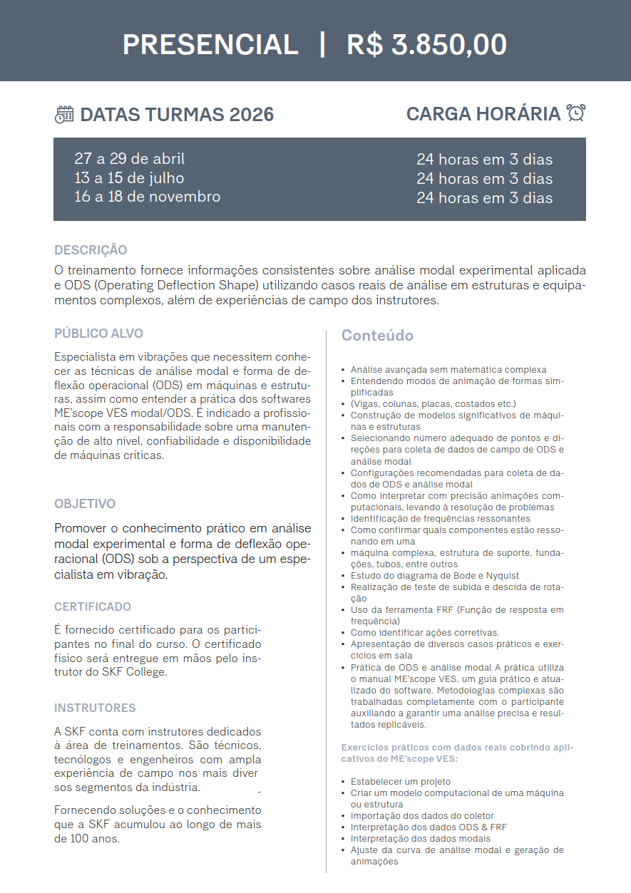 O treinamento fornece informações consistentes sobre análise modal experimental aplicada e ODS (Operating Deflection Shape) utilizando casos reais de análise em estruturas e equipamentos complexos, além de experiências de campo dos instrutores.