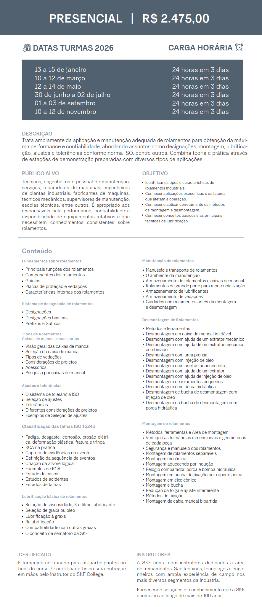 O curso tecnologia e manutenção de rolamentos trata da aplicação e manutenção adequada de rolamentos para obtenção da máxima performance e confiabilidade, abordando assuntos como designações, montagem, lubrificação, ajustes e tolerâncias conforme norma ISO, dentre outros. Combina teoria e prática através de estações de demonstração preparadas com diversos tipos de aplicações.