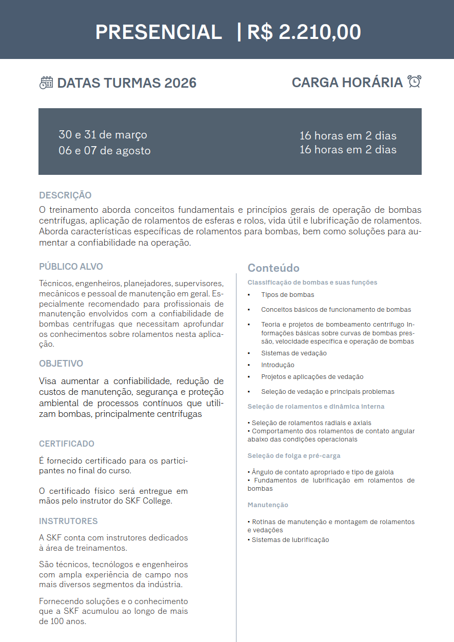 O treinamento aborda conceitos fundamentais e princípios gerais de operação de bombas centrífugas, aplicação de rolamentos de esferas e rolos, vida útil e lubrificação de rolamentos. Aborda características específicas de rolamentos para bombas, bem como soluções para aumentar a confiabilidade na operação