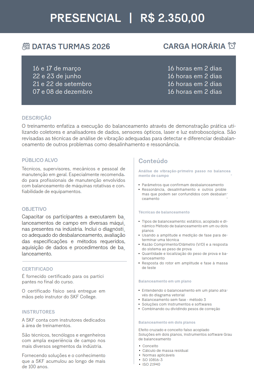 O curso enfatiza a execução do balanceamento utilizando coletores e analisadores de dados, sensores ópticos, laser a luz estroboscópica. São revisadas as técnicas de análise de vibração adequadas para detectar e diferenciar desbalanceamento de outros problemas como desalinhamento e ressonância. É indicado para aprofundar os conhecimentos de balanceamento máquinas nos cursos mais avançados sobre balanceamentos.