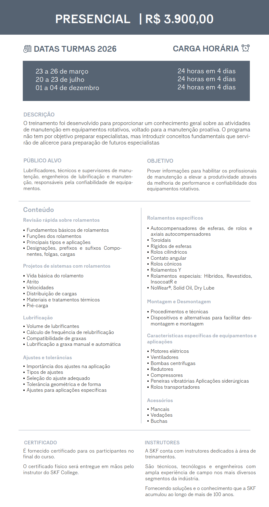 Este curso fornece os fundamentos avançados de aplicação de rolamentos industriais. Aborda características de projeto e definição de arranjos de rolamentos, características específicas de rolamentos, além de detalhamento de diversas aplicações. Serão demonstrados os métodos comuns e avançados de montagem e desmontagem de rolamentos.